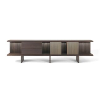 The richness and distinctiveness of this piece of furniture is not only given by its volumes but also by the sophisticated brass fillet insert, whose design is a clear reference to the grain of the wood. This decoration, alternating with the materiality of the piece of furniture, gives the object a new importance that refers to the Italian cabinet-making school and to Boulle’s traditional furniture.