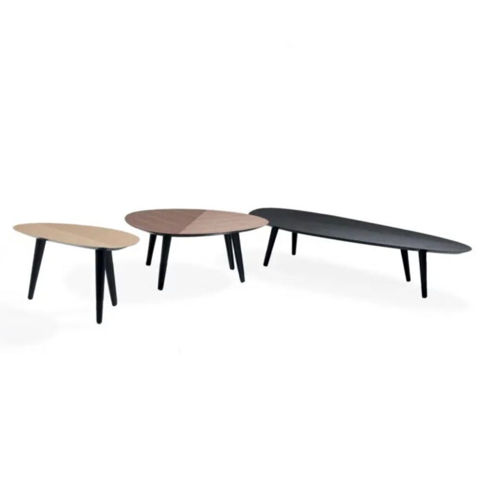 Three new coffee tables designed to complete large sofa islands and offer a practical surface at various heights. The surface stands out for the inlaid processing crafted diagonally with a specular game of outstanding precision which lends it an unusual perception, which is different every time depending on the observation point: the thin sheets of solid oak wood or Canaletto walnut wood are carefully placed side by side until the natural lines in the wood create a graphic sign in continuity with the diagonal line that separates the two parts of the table top, almost as if it were forming the veins on a leaf.