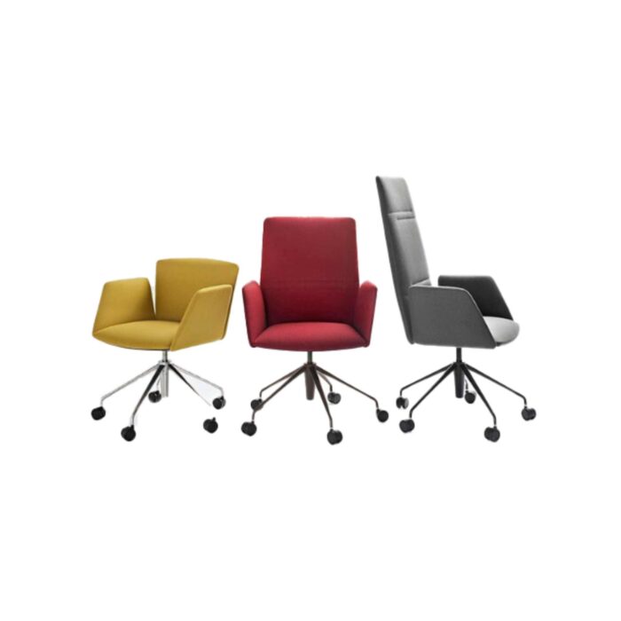 The collection, conceived for office, soft-contract and residential spaces, is available with sled and cantilever base, with 4 legs in wood or 4 and 5 spoke swivel on feet or fixed on castors. The spokes are made by pushing metal manufacturing to its limits: tapered steel tubes, cold-formed with a variable cross section, are at the end elegant, lightweight supporting frames.