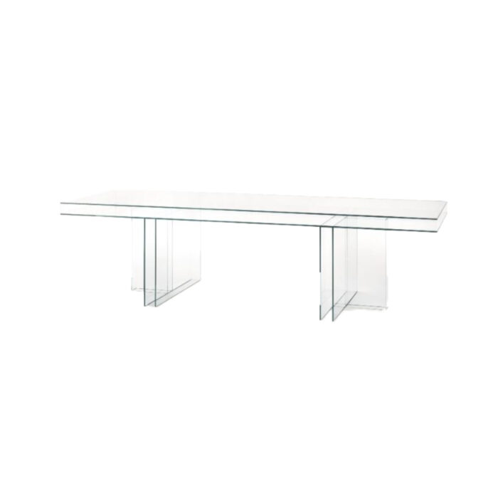 Table constructed from boxed volumes in mm. 10 thick transparent extralight tempered glass, obtained thanks to complex gluing manufacturing. The top is supported by two âTâ shaped bases and it has a parallelepiped shape opened on the two The result is a table of great strength and formal purity and at the same time characterized by the great volumetric presence.