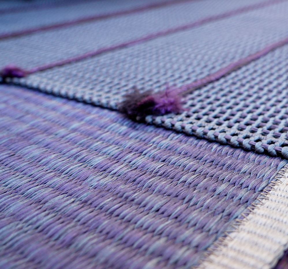 This modular rug for exterior and interior environments is created by sewing lengthwise with Punto Zigzag stripes in Kimia fabric with a width of 15 cm and different lengths.