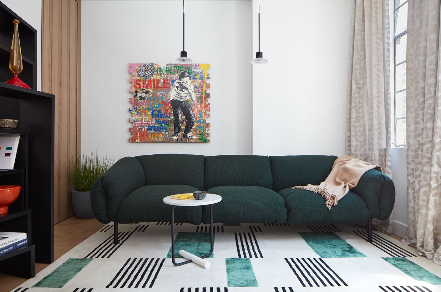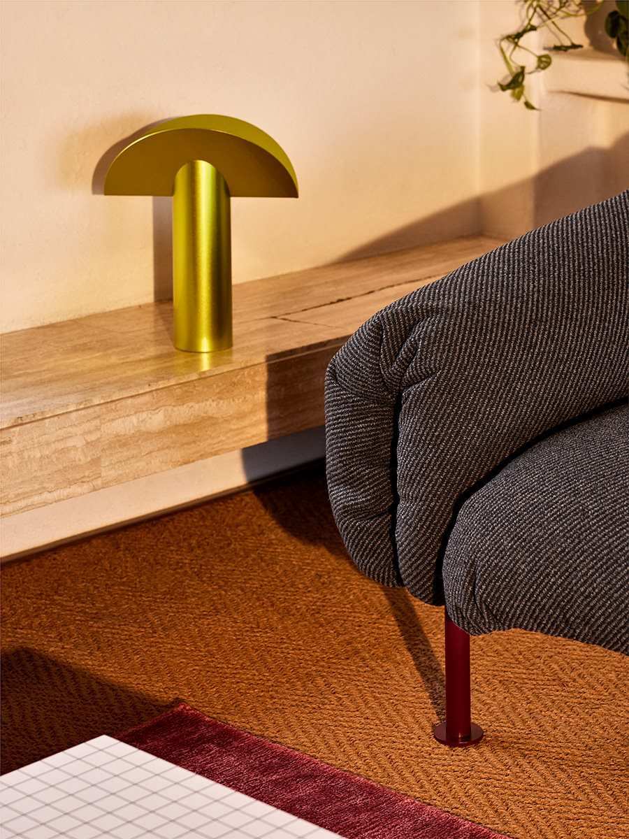 Monobloc sofas. Carrying frame in orange, amaranth, grass green or black painted steel, complete of stiff polyester straps in the shade anthracite for the support of the cushions. Seat, back and armrest cushions in polyurethane/ regenerated and regenerable polyester balls. Paddings assembly without glues. Removable fabric cover.